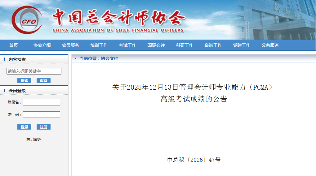 根据管理会计师专业能力(PCMA)高级考试等有关规定,现将2025年12月13日管理会计师专业能力(PCMA)高级考试成绩在中国总会计师协会(以下简称中总协)官网(www.cacfo.com)公布。相关事项公告如下: